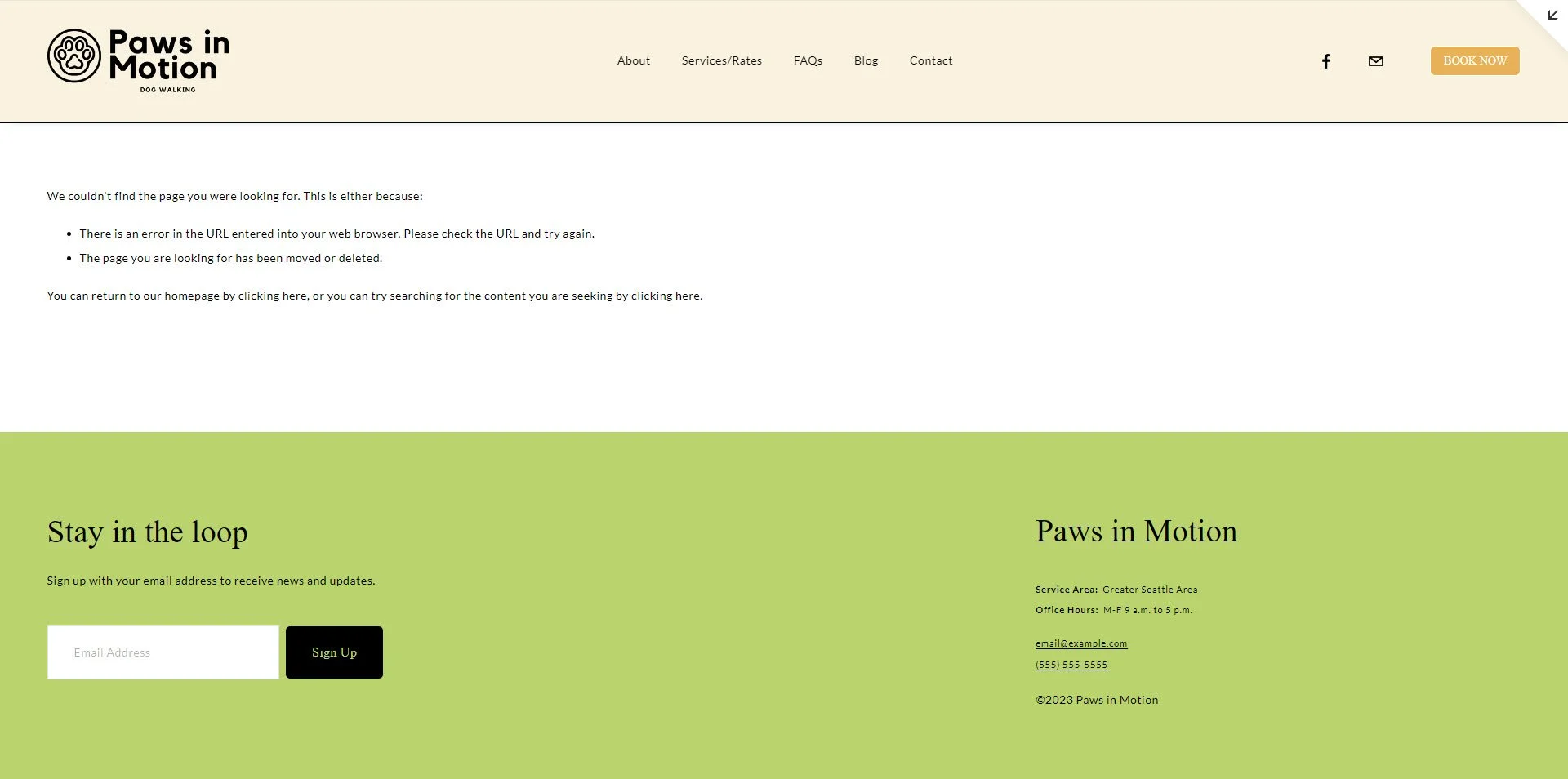 Let’s take a look at the Squarespace default. Squarespace has automatically created it with the same colors, typography and branding as your website. It contains a header and a footer and people will know that they’ve gotten to your website, which is good. The text explains why you may have gotten this error and gives you ways to find the page you were looking for. But so much more can be done!